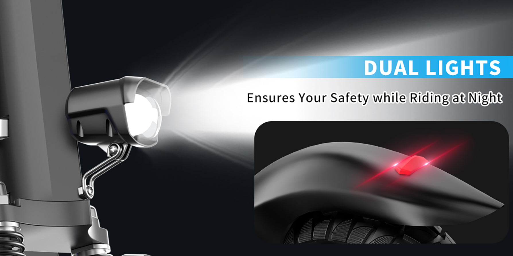 Equipped with dual front and rear lights, the scooter enhances visibility at night for a safer and more secure ride.