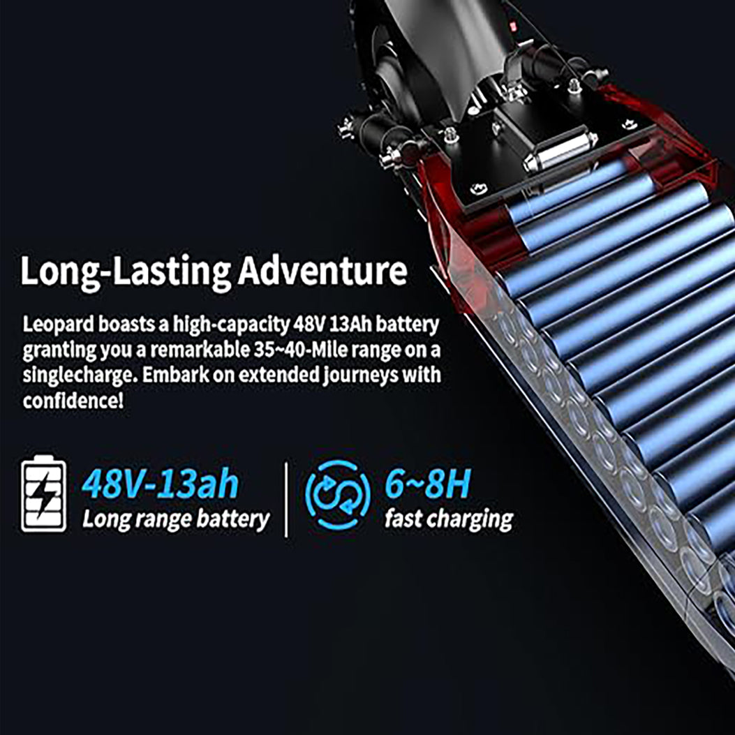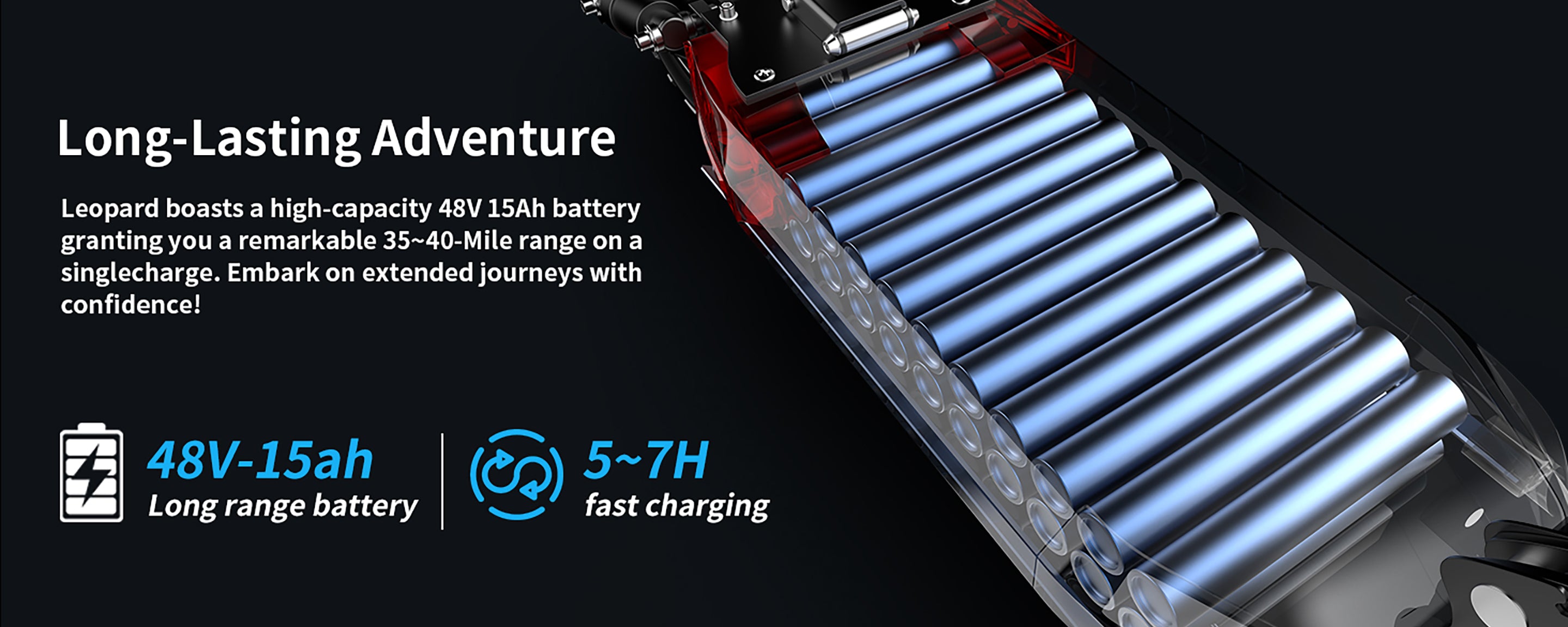 The Leopard features a high-capacity 48V 15Ah battery, offering a 35–40 mile range on a single charge with a fast 5–7 hour charging time, enabling worry-free long-distance adventures.