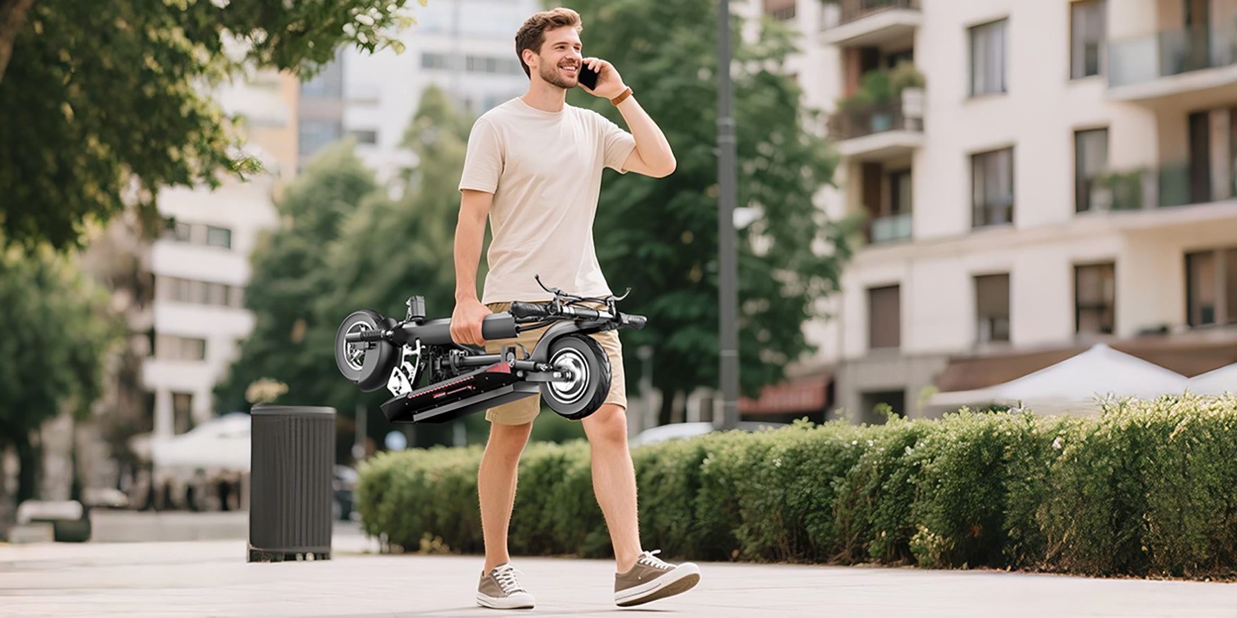 A man walks out of his residential area, effortlessly carrying the scooter in one hand while taking a call with the other, highlighting the scooter’s portability for flexible and convenient daily commuting.