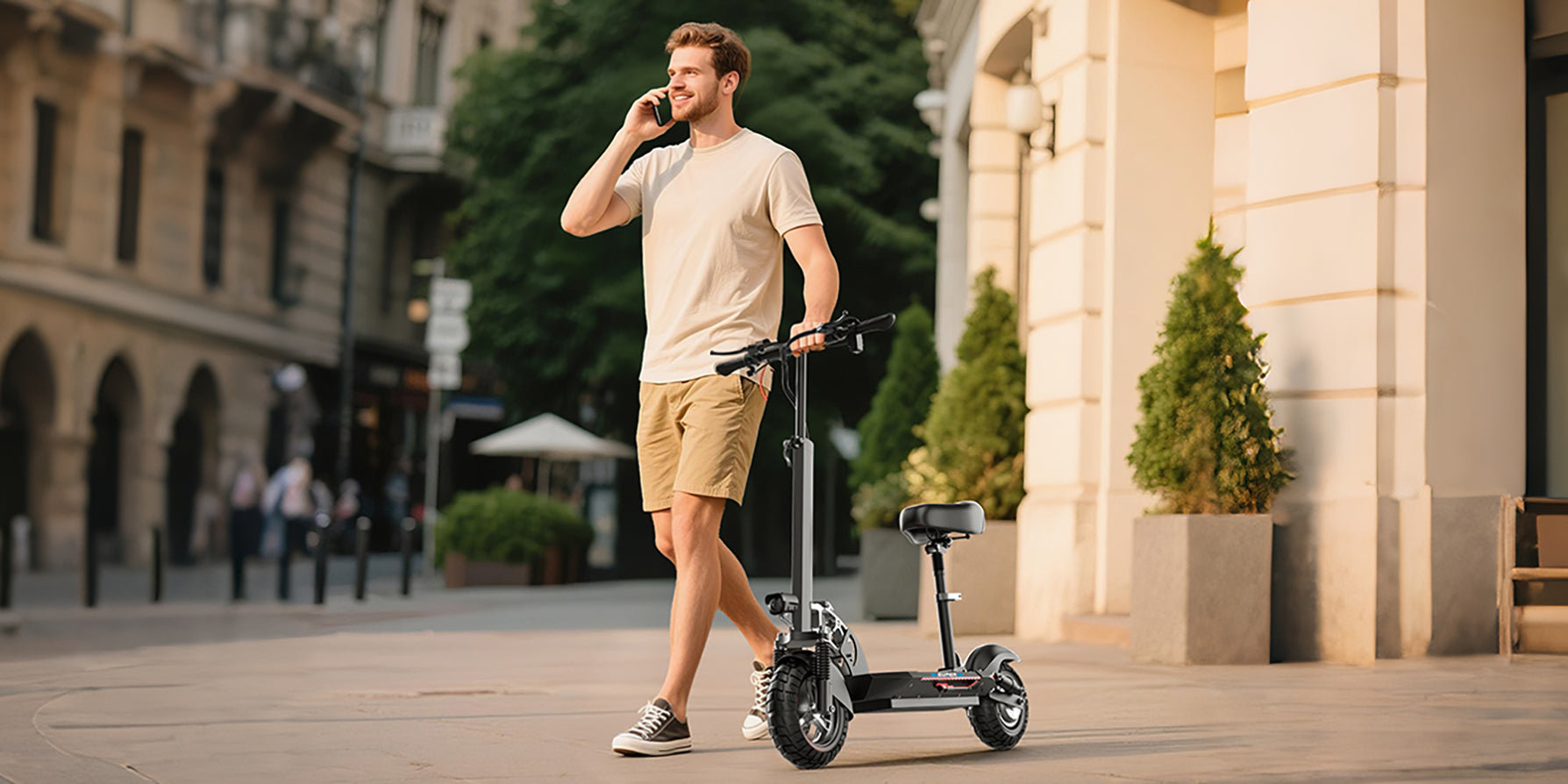 A man walks on the street, taking a call while easily pushing the scooter, showcasing its lightweight and portable design for more flexible daily commuting.