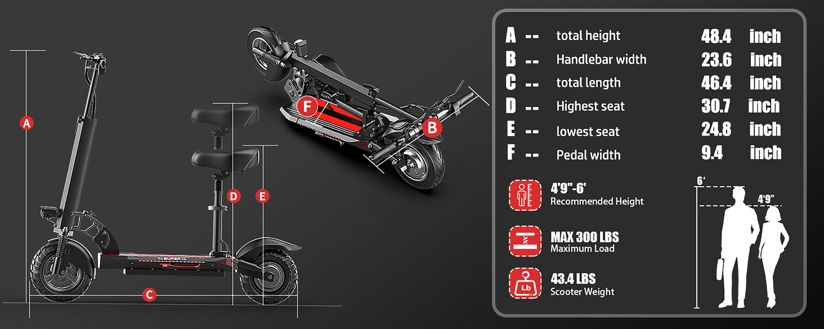 The scooter features a total height of 48.4", handlebar width of 23.6", total length of 46.4", adjustable seat height of 24.8–30.7", and pedal width of 9.4". Recommended for riders 49" and taller, it supports up to 300 lbs with a total weight of 43.4 lbs, ensuring both comfort and stability.