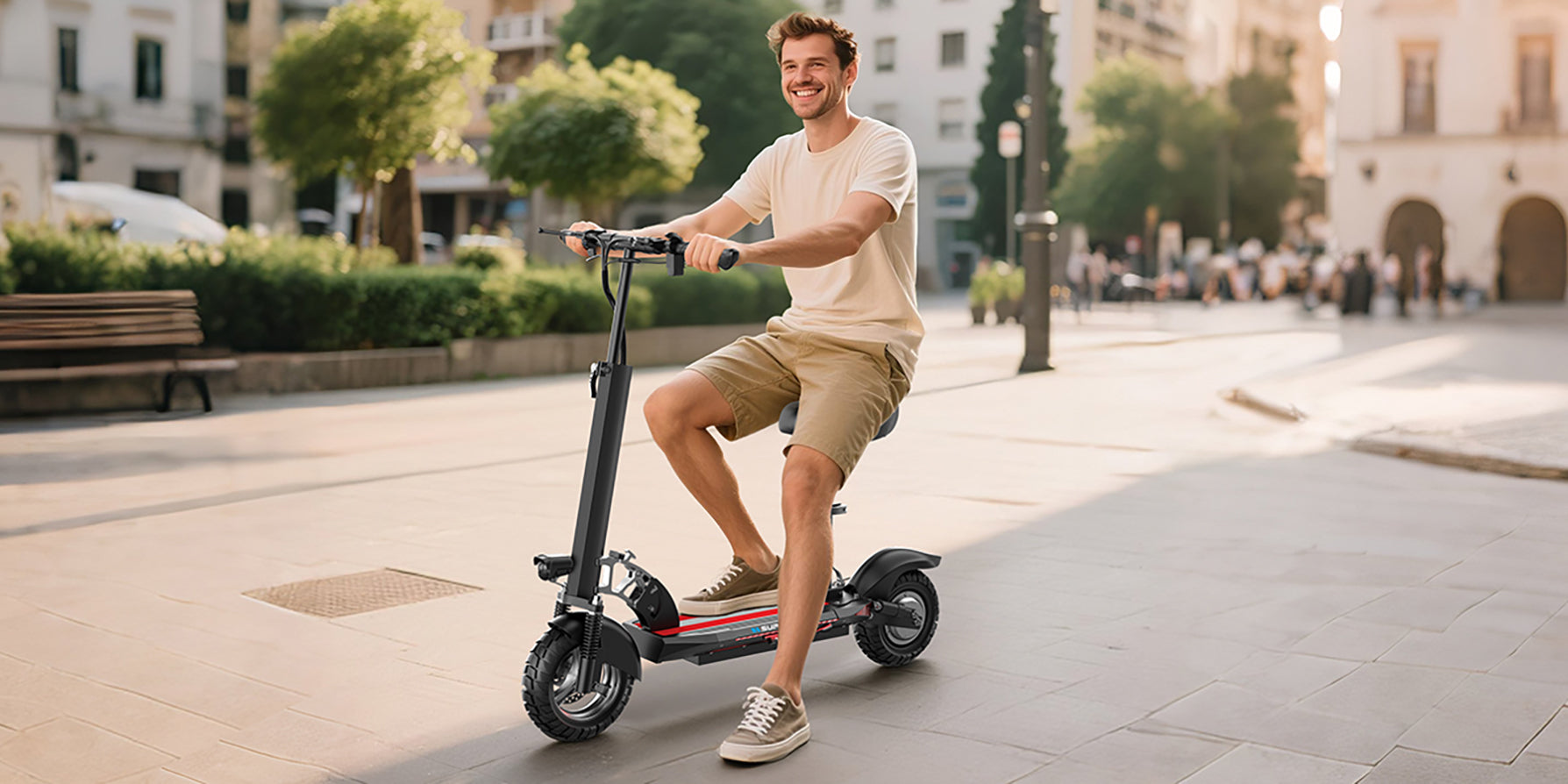 A man rides the scooter through the city center, enjoying agile handling and a comfortable experience for easier and more efficient urban commuting.