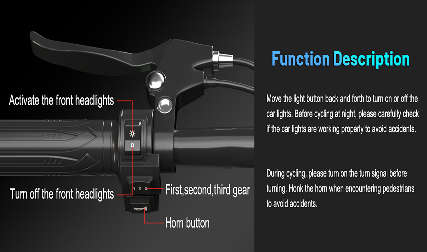 Activate the front headlights with the light button and ensure they work properly before riding at night. Use turn signals when turning and honk the horn when encountering pedestrians to enhance riding safety.