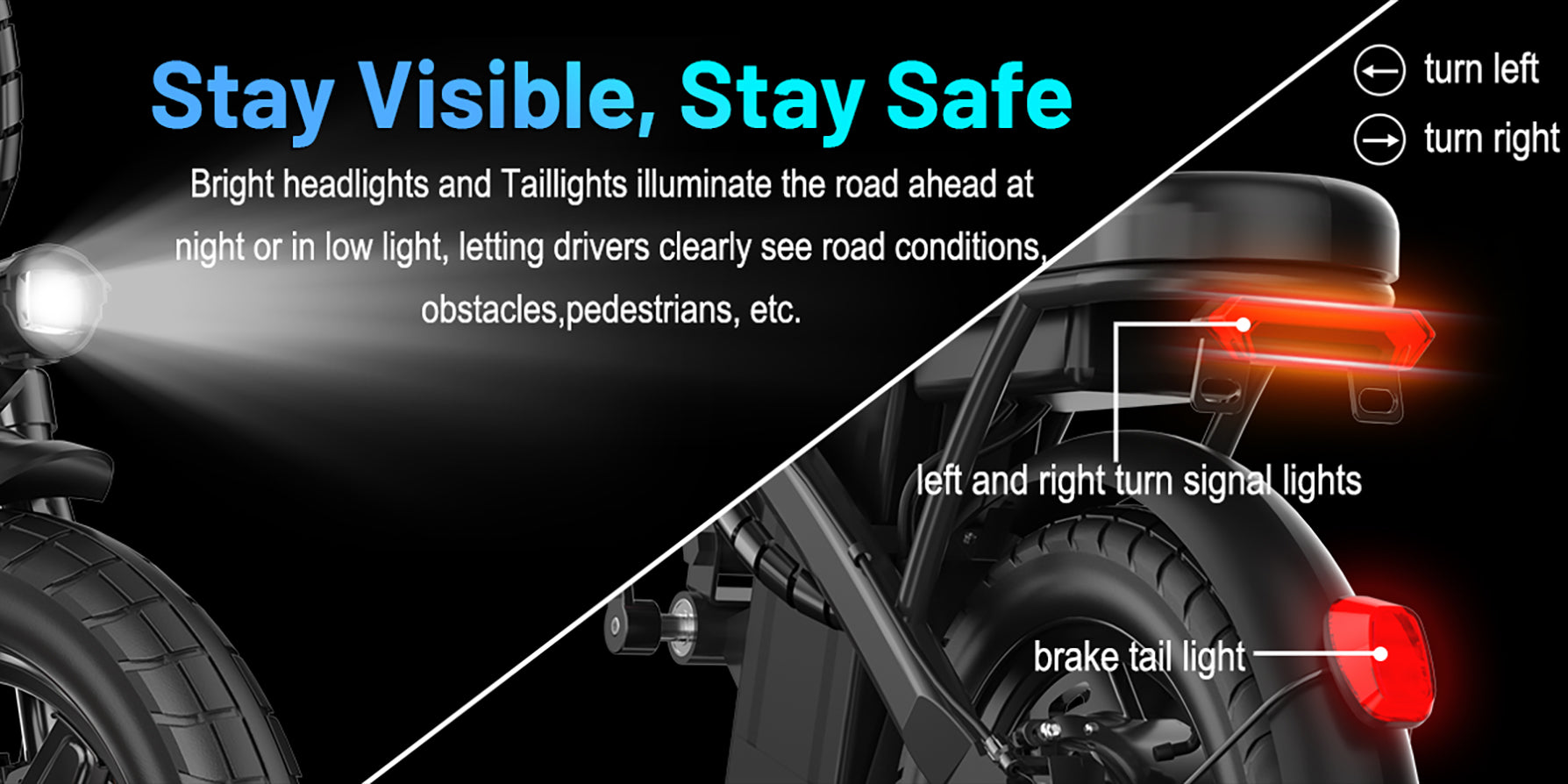 Bright headlights and taillights illuminate the road in low-light conditions, while left/right turn signals and brake lights alert others, ensuring safer and more visible rides at night.