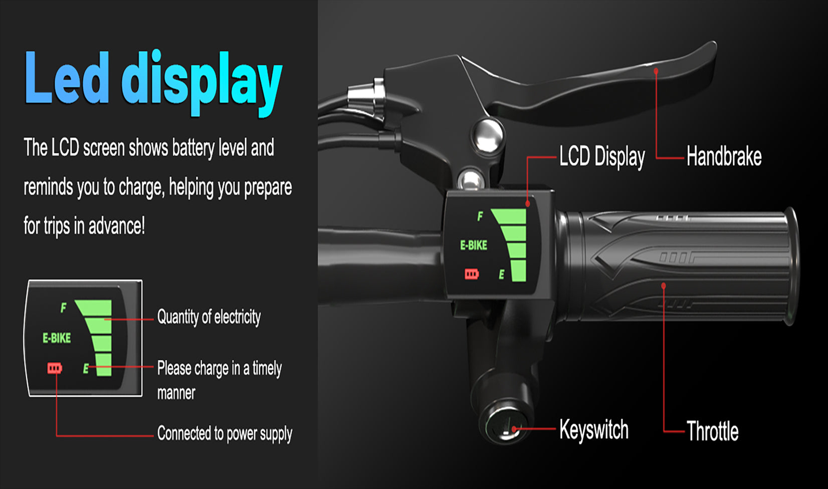The LCD screen shows battery level and reminds you to charge in time. It also displays key switch and throttle status when connected to power, helping riders prepare for trips and enhancing convenience and safety.