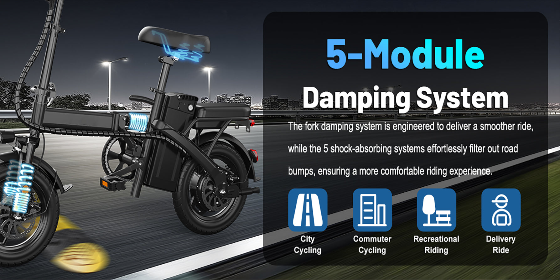 The fork damping system, combined with 5 shock-absorbing modules, efficiently smooths out bumps, providing a comfortable and stable ride for city commuting, recreational cycling, and delivery trips.