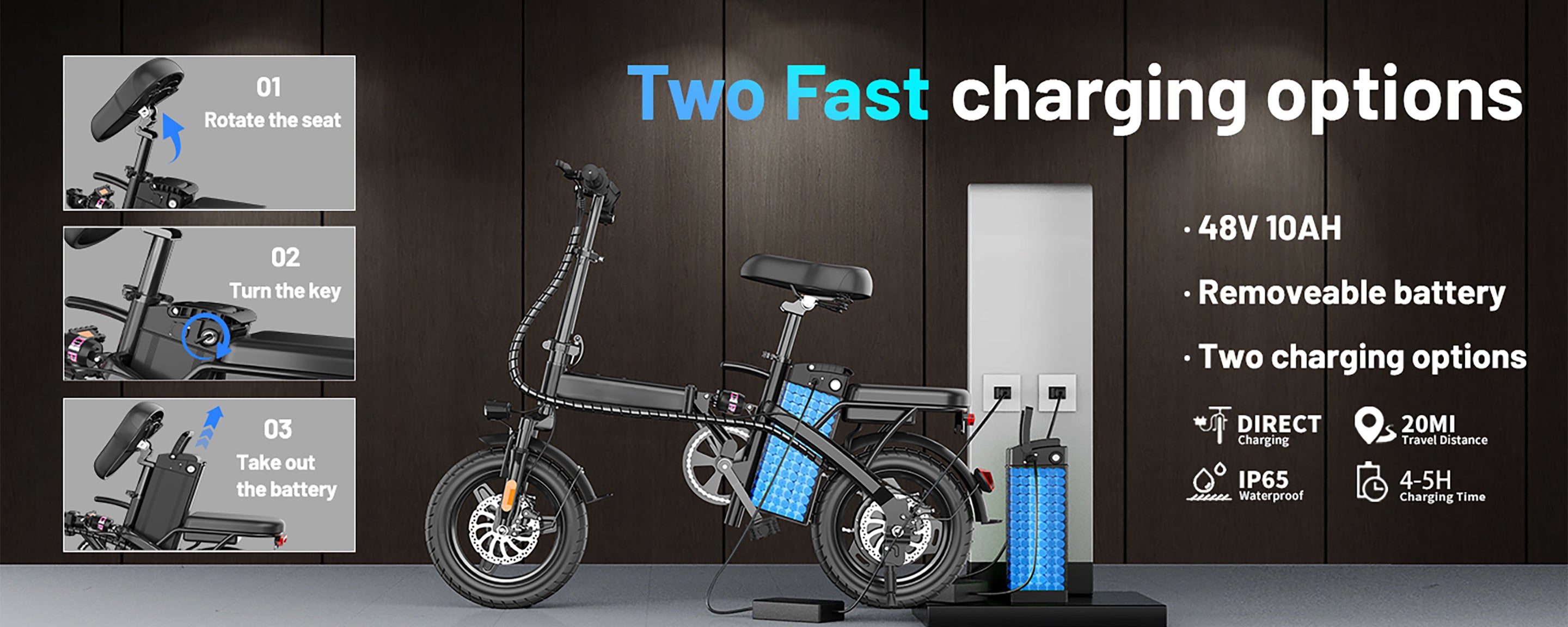 The scooter features a 48V 10Ah removable battery with two charging options: direct charging or charging after removal. It offers a 20-mile travel range, IP65 waterproof rating, and a fast 4–5 hour charge, making daily commuting and short trips effortless.