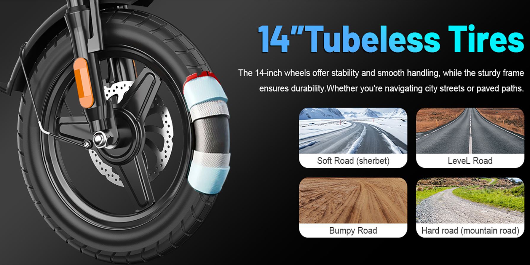 Equipped with 14-inch tubeless tires, the scooter offers excellent stability and smooth handling. The sturdy frame ensures durability, making it suitable for city streets, paved paths, bumpy roads, and mountain trails.